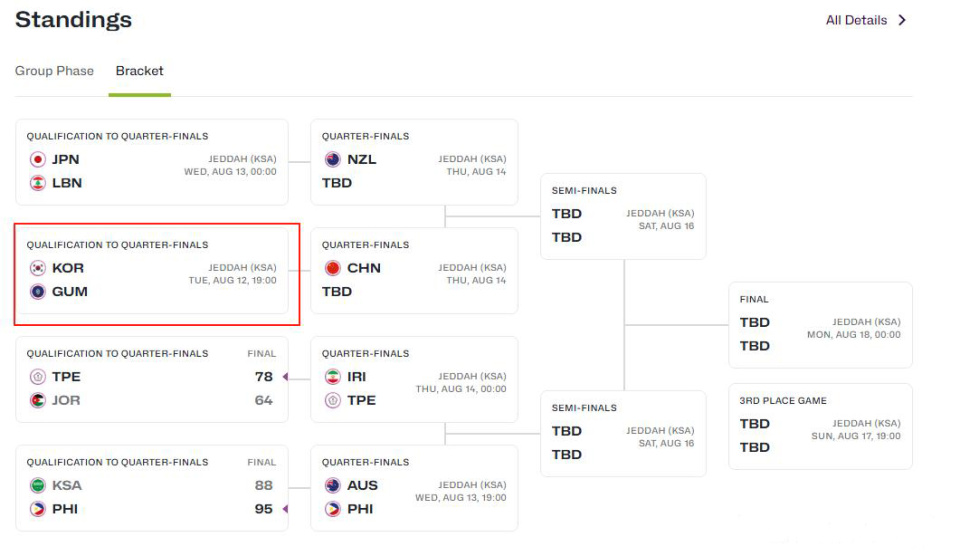 根据赛程安排,中国男篮的四分之一决赛对手将在韩国队与关岛队之间产生。该场比赛定于北京时间8月12日19:00进行,届时CCTV5将进行现场直播。从小组赛战绩来看,韩国队(2胜1负)整体实力明显优于关岛队(1胜2负),尽管韩国队有两名主力球员因伤缺阵,但仍是更被看好的晋级方。